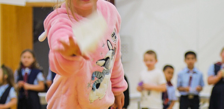 After worship time was over, the gym was rearranged so that everyone could sit at tables, and a TV screen was rolled up to show close-ups of how to do certain types of stitches. Parents assisted Adventurers with needle, thread, and thimble, as they worked together on two main projects: a pincushion (filled with cotton stuffing) and a beanbag (filled with lentils).